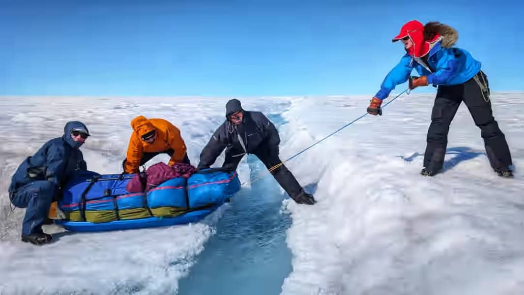 The team got up an hour earlier today to make the most of the day. We set off at 8:00 AM so we could walk on hard snow for longer. A steep slope upwards required perseverance, because the sleds now weigh 80 kilos. Progress is slow on the slope, no more than one and a half kilometers per hour.