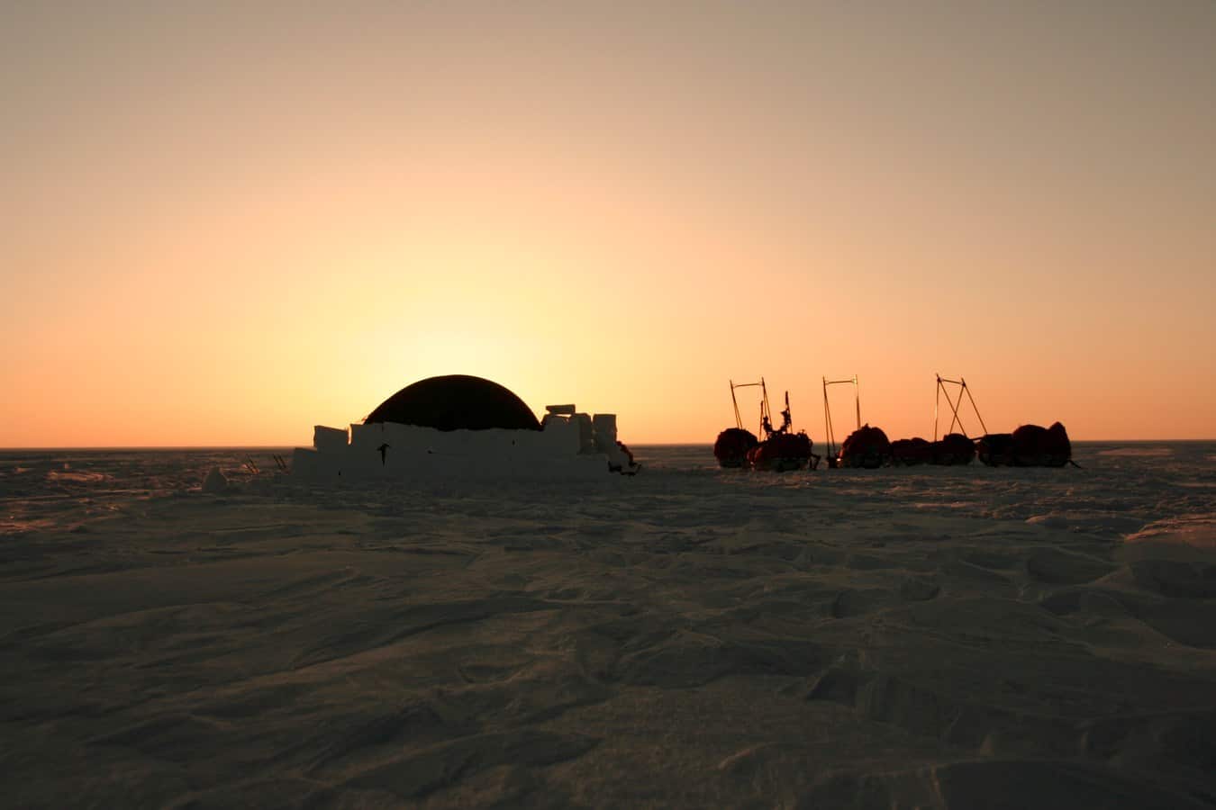 When we clean up the tent, we roll it up with half the tent poles still in it. Then we bend the tent poles and roll the tent up against the wind. The tent goes into a large tent bag and is transported on our sled to the next encampment. There we secure a guy line in the snow to anchor the tent. With at least two people, we set up the tent, anchor it with the pegs and tension the tent. We also make a wall of snow by cutting snow blocks and put them on the windward side, where the wind comes from. This ensures a better night’s sleep in high winds. In addition, we make a 30-centimeter pit in the awning so that we can sit comfortably and easily remove our coats and shoes.