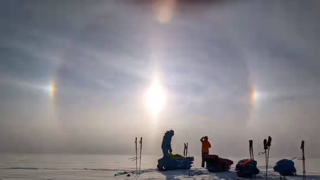 On Friday, we started at six in the morning, but visibility was zero. We found ourselves in the middle of a white-out; everything around us was white. After two shifts, however, a moment of clarity broke through. The sun emerged, creating a halo with two rainbows, a rare natural phenomenon that only occurs in Arctic conditions. Unfortunately, it didn’t last long, and soon we were back in the white-out. Navigating was challenging without wind, causing us to meander like a river through the snow. It felt like walking through a carton of milk or being inside a ping pong ball. The distance between the front and back of our group could reach up to 100 meters, making the whole experience surreal.