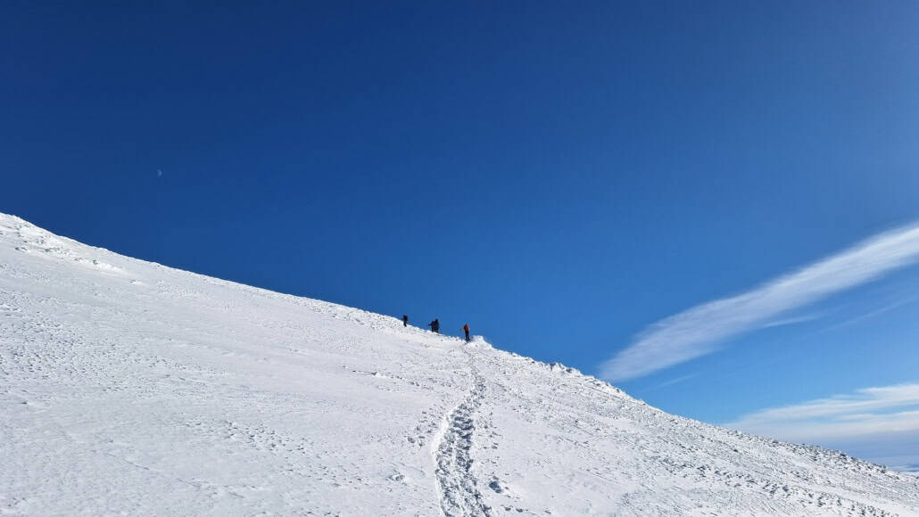 Vandaag sluit John zich bij ons aan. Een lokale gids met kennis van de berg. We starten vroeg. Eerst met ski’s, dan op sneeuwschoenen. De route is afhankelijk van het weer en de omstandigheden.