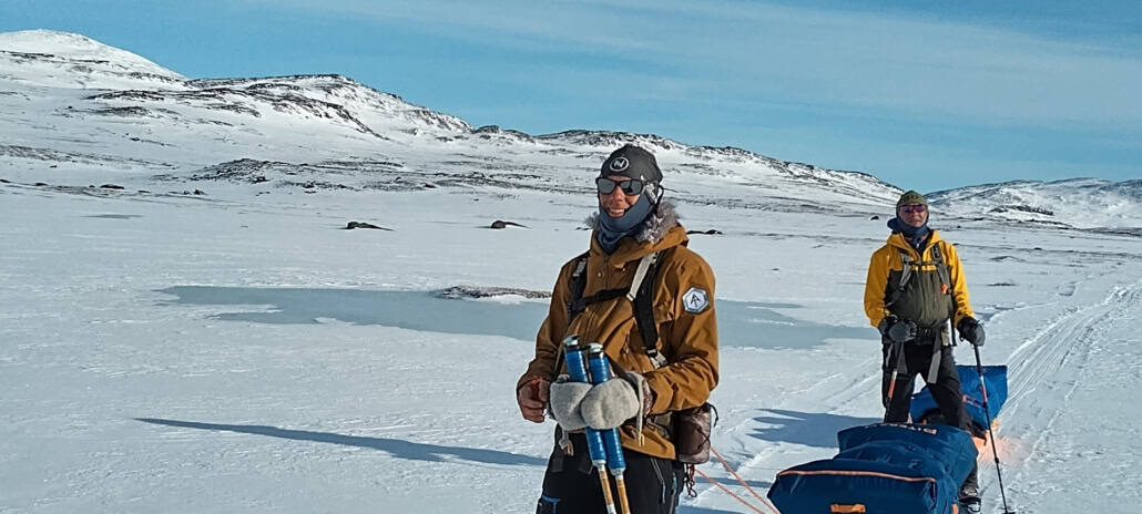 We pakken het kamp in en skiën verder, nu richting het zuidwesten. Het landschap opent zich. Je voelt hoe je lichaam went aan het ritme. Je slee glijdt achter je aan. We nemen regelmatig pauze. Warm drinken. Iets kleins eten. In de namiddag bouwen we ons kamp opnieuw op. Alles draait om eenvoud. Efficiëntie. Warm blijven. Rust pakken.