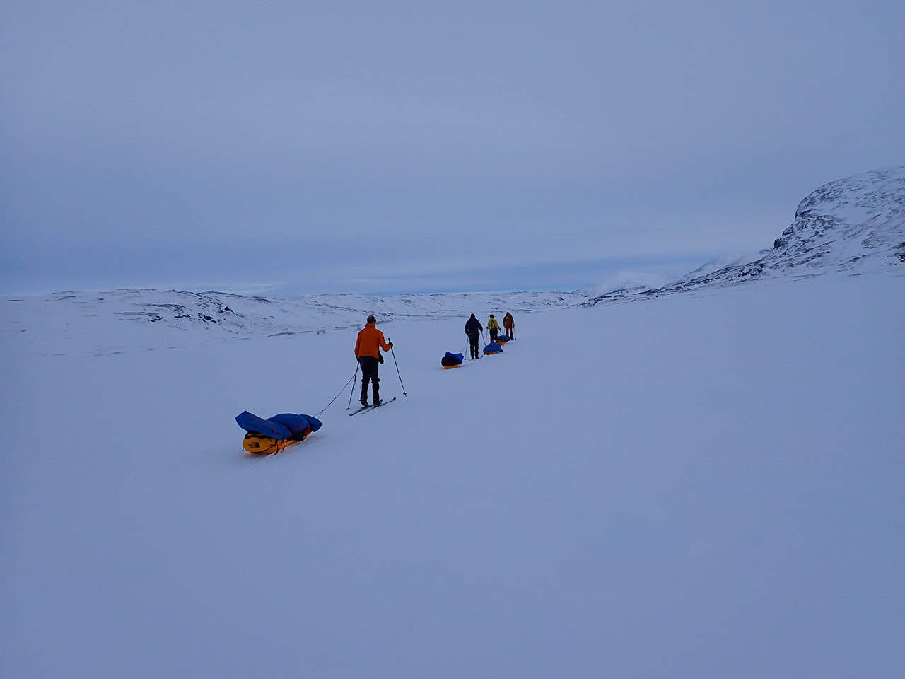 Deze dagen staan in het teken van de trekking. We staan om 7 uur op. Altans, dan gaat de wekker. Voor dat je je slaapzak uit komt, eet je eerst rustig je ontbijt. Om 9 uur staan we klaar. Ski’s onder en slee achter ons aan. Klaar voor een nieuwe dag. De route die we volgen is de Kungsleden van Zuid naar Noord. Afhankelijk van de omstandigheden kunnen we afwijken en een omweg of een short-cut nemen.