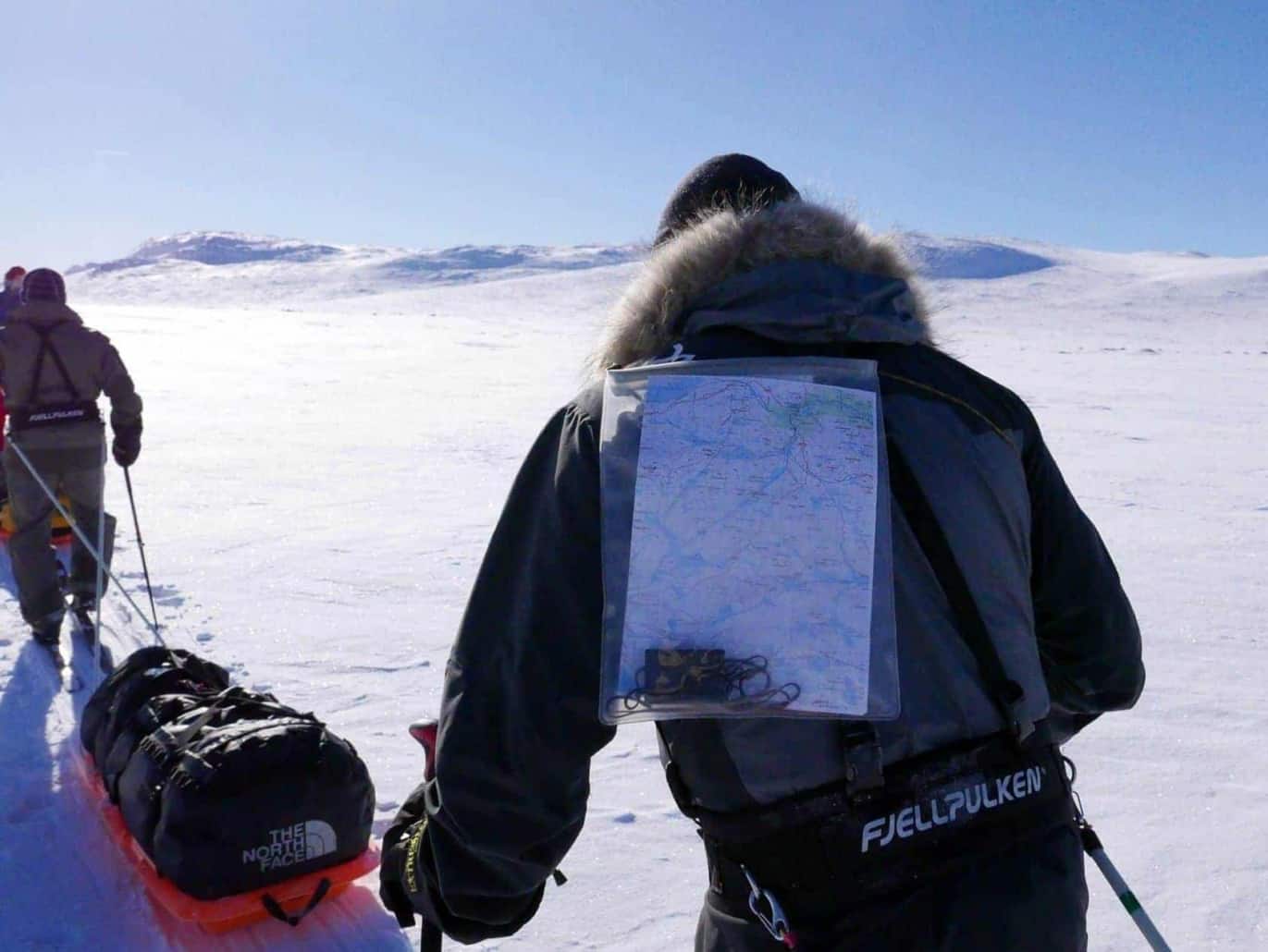 Kaart op de rug tijdens expeditie in de sneeuw