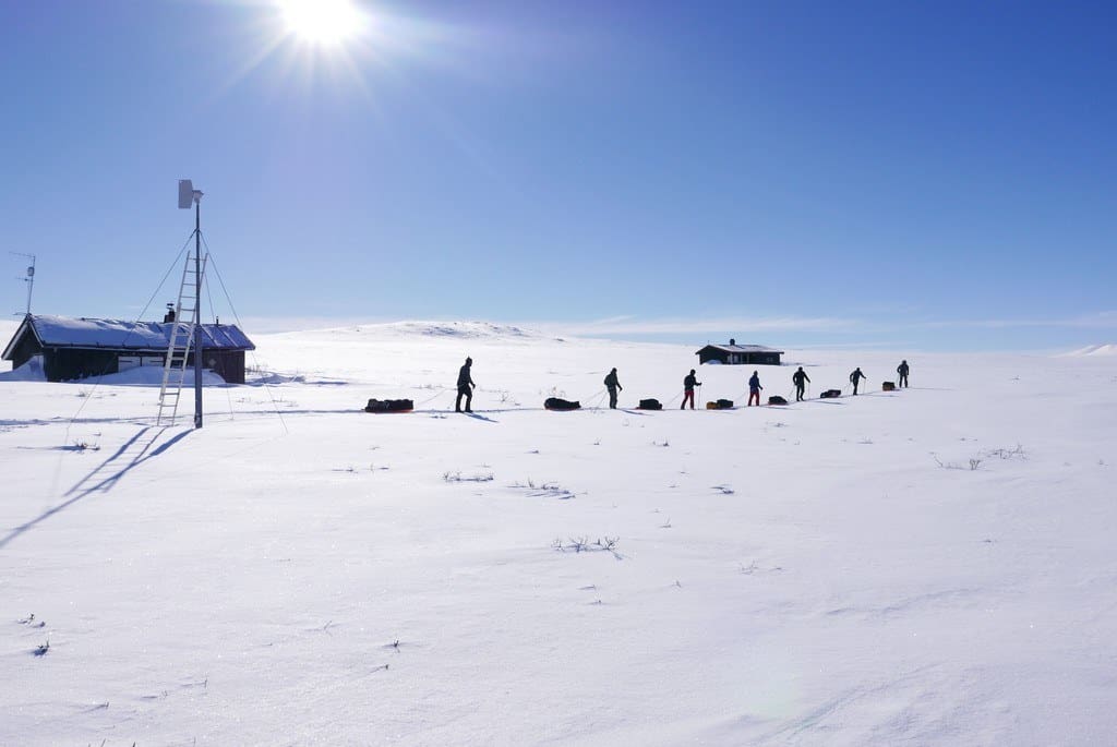 De Hardangervidda is een hoogte plateau. Voor ons betekende dat dat we de eerste dag behoorlijk wat meters moesten stijgen. Dat viel niet mee met een zware slee achter een ieder aan. Onwennig werd er met de ski’s door de sneeuw geploeterd. Maar langzaam maar zeker maakten we meters. Meters door het onmetelijke mooie landschap. Links van ons rotsen die het hoogteplateau van ons scheidde, rechts van ons een ondiepe vallei en voor ons een langzaam omhoog glooiend landschap.